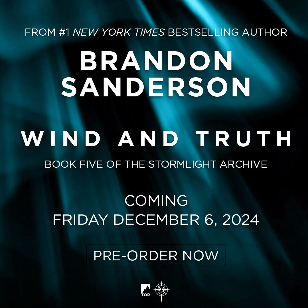 Brandon Sanderson @BrandSanderson The climax to the first arc of #TheStormlightArchive series is coming & the fate of the world—& the Cosmere—will hang in the balance. Add #WindandTruth to your shelf Friday, December 6, 2024 @torbooks