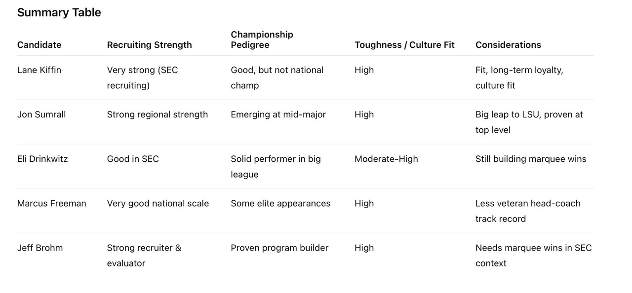 I told it to pretend I'm the LSU AD and need to find our next coach. I told it that I want a coach that can build very tough teams similar to those Les Miles had but one with a modern offense.