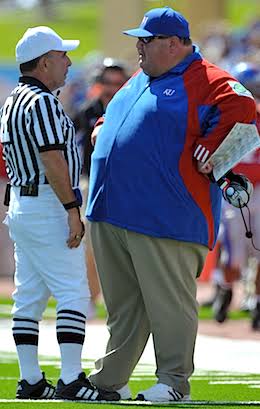 Ever see Mark Mangino? You could land a helicopter on his back. When he would wear the Kansas jacket in their red color, he looked like the Kool Aid man.