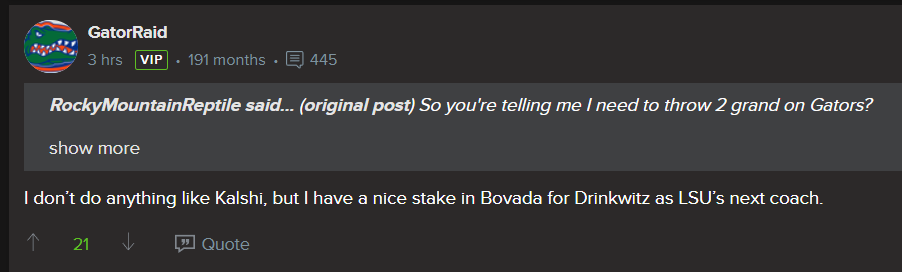 Obviously both fanbases as a whole want Kiffin. Like I said, it just appears to me Florida is a tad more all-in on Kiffin than LSU. There’s absolutely no way to quantify this, I’m just telling you what I’m seeing/hearing and feeling.