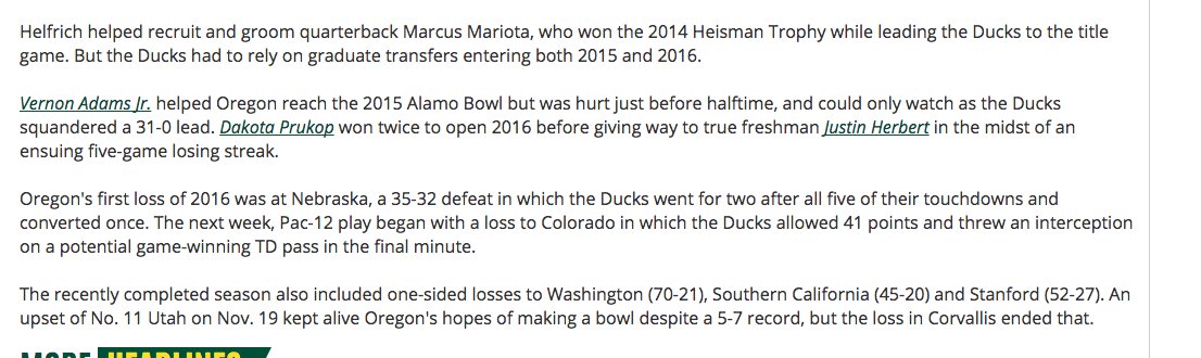It was more than the record. They'd been slipping in all the little things for his tenure. They were sloppy. Mariota covered up for a lot of that. Then the LOIC type stuff began happening. Some of that has been getting exposed in the Eugene media of late. I'm sure that factored in. The previous two coaches would have bounced several of these players before it got to where it got to under Helf.