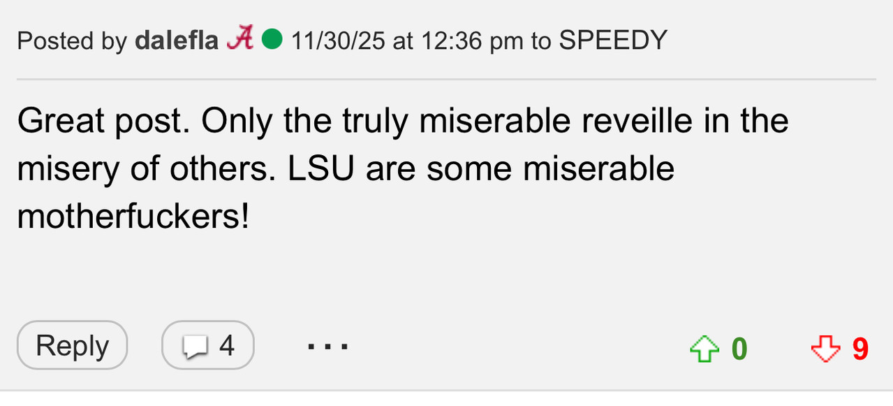 Great post. Only the truly miserable reveille in the misery of others. LSU are some miserable motherfrickers!