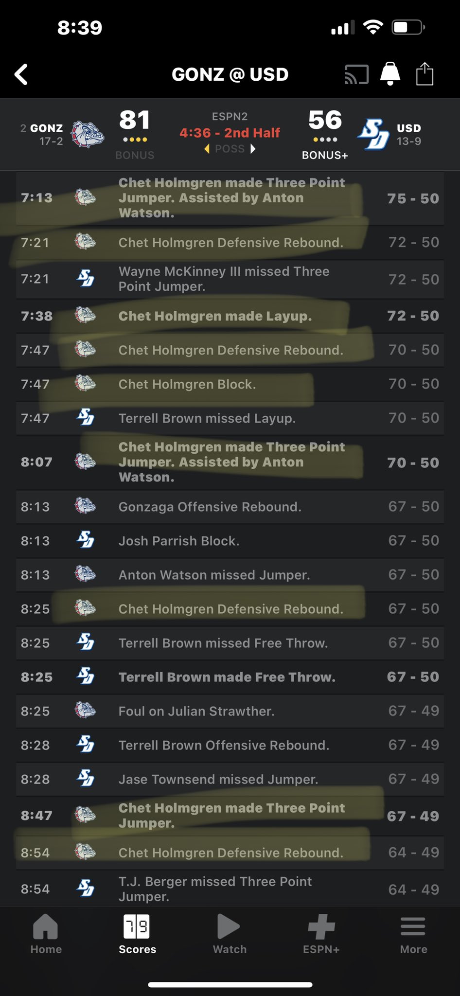 “Holmgren putting on a show here in San Diego with 23 PTS, 12 REBS and 4 BLK. Hitting pull up and spot 3s, changing everything around the rim, finishing through contact. Say what you want about the level, but this is a No. 1 pick if I've ever seen one.”