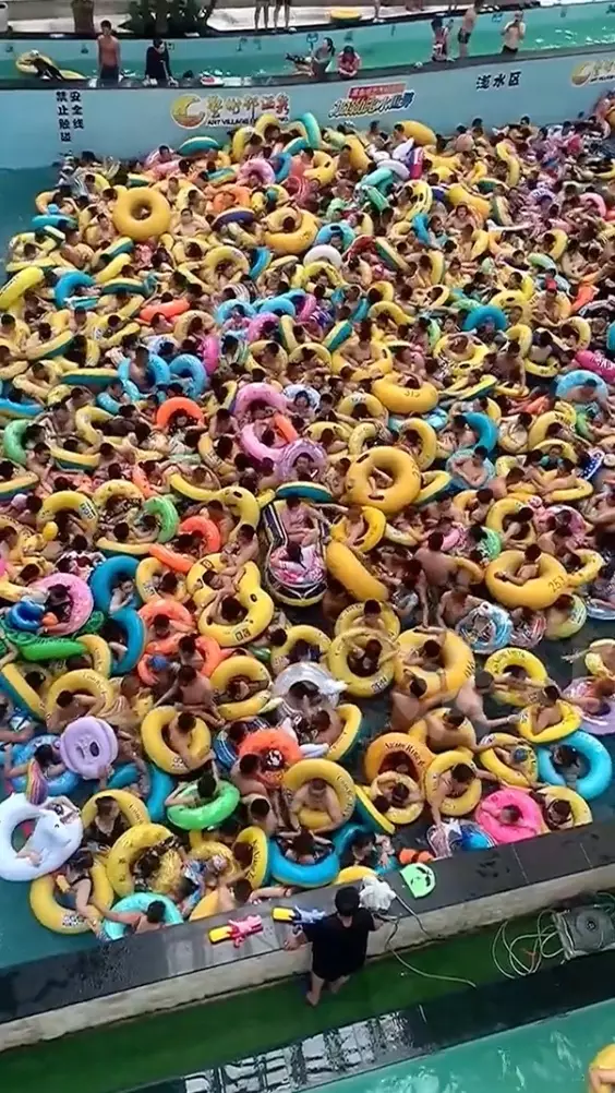 Video footage of Heiyuhu Water Amusement Park in the city of Daqing in Heilongjiang Province, northeast China, shows attendees on 7 August resembling ‘fruit loops cereal’ as they piled on top of each other in the water.
