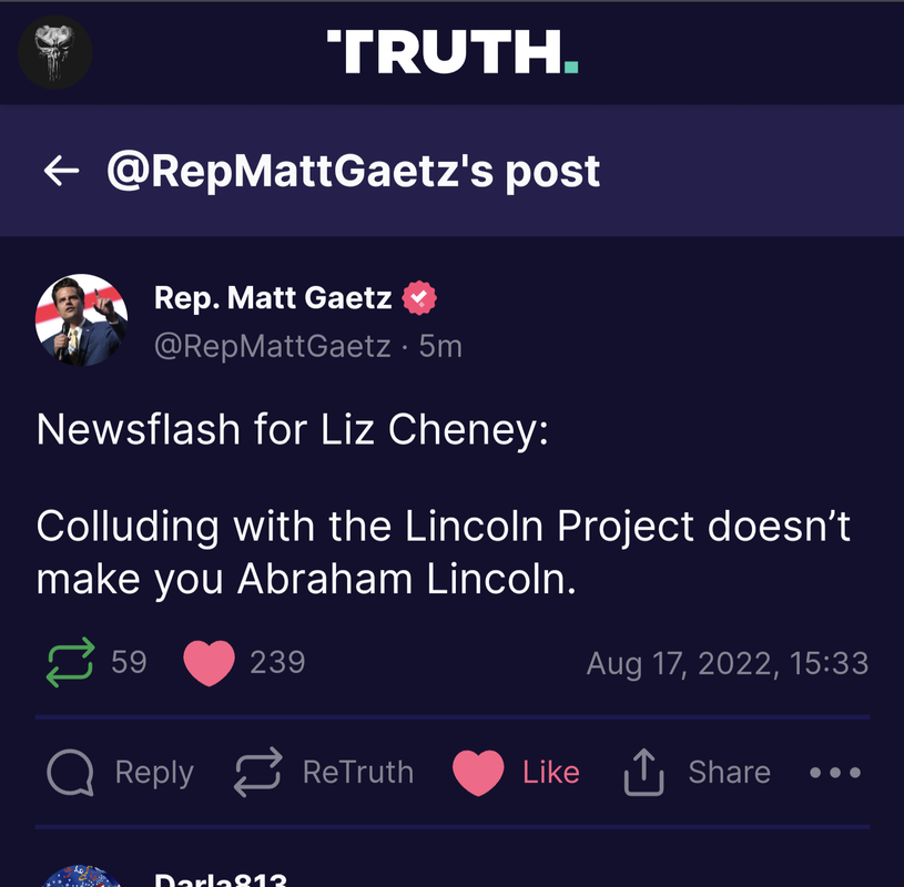 Lizbraham Lincoln won't take that shite. She gonna release a statement blaming trump for Gaetz mocking her..