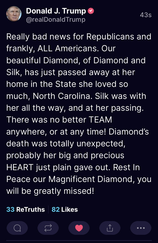 Diamond of Diamond and Silk has passed away. Trump offers condolences.