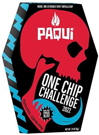 THE PAQUI ONE CHIP CHALLENGE IS INTENDED FOR ADULTS ONLY, WITH CLEAR AND PROMINENT LABELING HIGHLIGHTING THE CHIP IS NOT FOR CHILDREN OR ANYONE SENSITIVE TO SPICY FOODS OR WHO HAS FOOD ALLERGIES, IS PREGNANT OR HAS UNDERLYING HEALTH CONDITIONS.