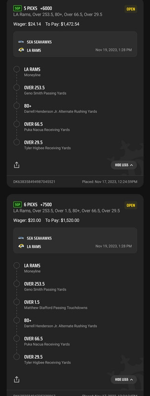 My strategy that's worked well the last month is take a game I think I have a feel for and pick iterations of correlated plays that make sense to me. here's what i came up with for tomorrow. I'm going to add a few iterations of the bets below with Seattle receiving overs