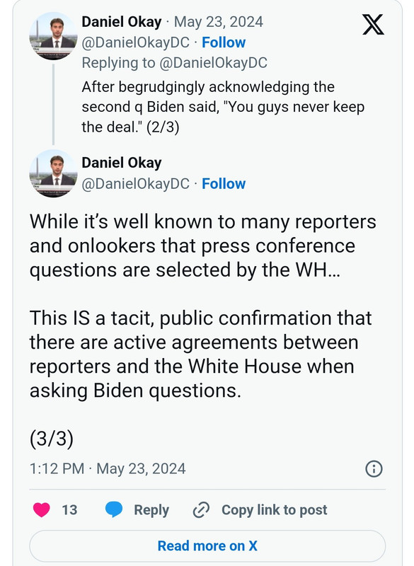 He gives the game away by saying to the media "you guys never keep the deal" because one reporter went off script and asked a 2nd question instead of the pre-approved 1 the entire thing is a farce. Skip to 2:35