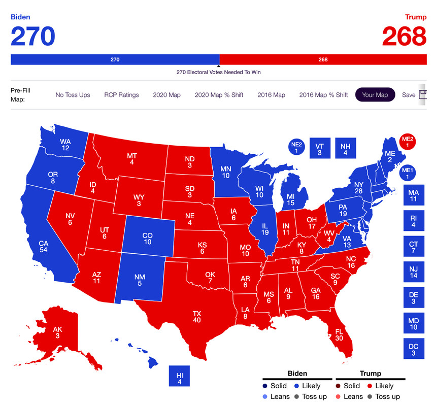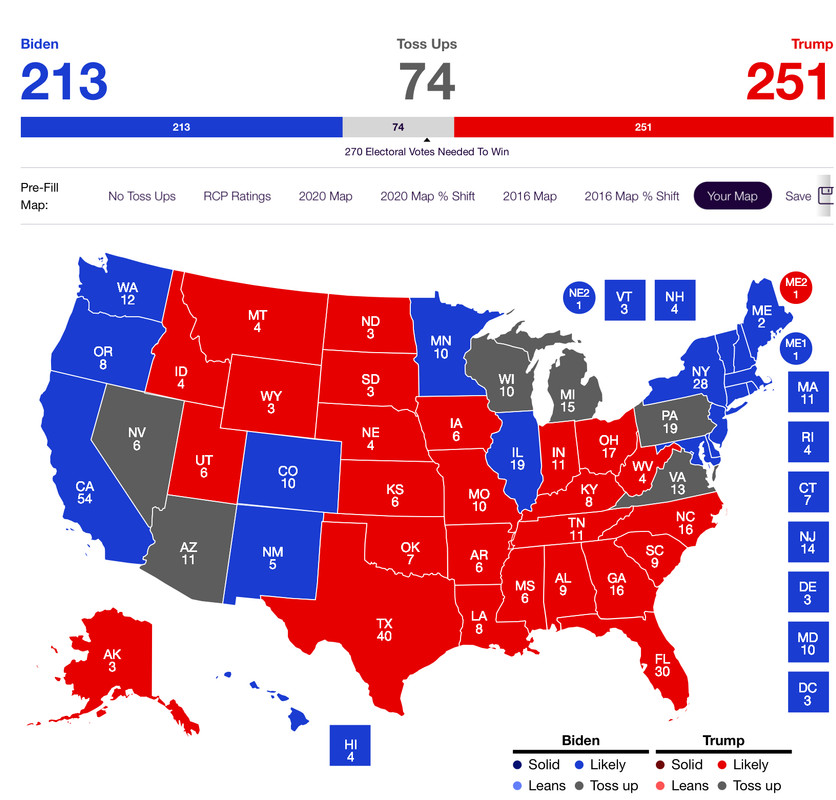 I think it comes down to these 6 toss-up states. Trump either needs just PA, or a combination of any two of the 6 to win, except just NV and AZ, just NV and WI, or just NV and VA. Nevada and either MI or PA wins it also.