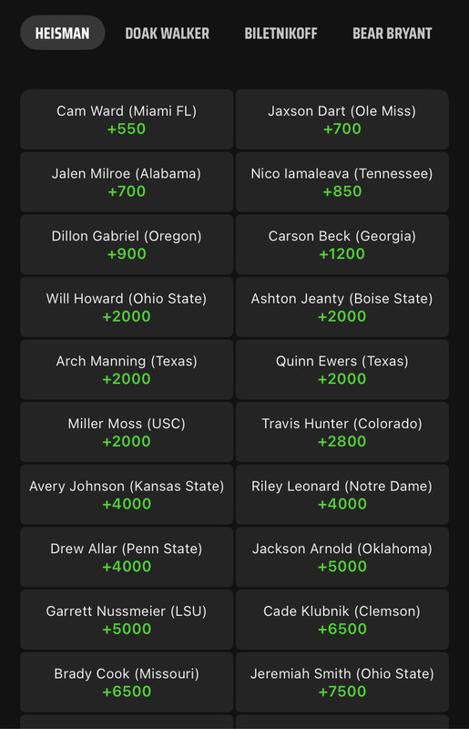 Threw some money on Nico a few weeks ago at +1200. Prob won’t win but he had good odds with their schedule. If they beat UGA he will shoot up