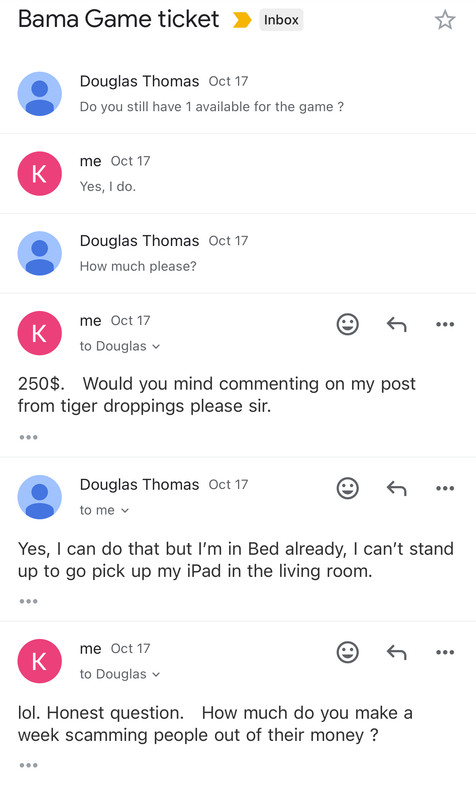 So just a heads up scammers are now reaching out to sellers acting interested in purchasing a ticket from you. Once they agree to the purchase they act concerned about being scammed and want you to send them a screen shot of your ticket or something of the like to confirm the validity of it. This is all a ploy to have pictures of something that looks legit so they can in turn use it as ammo in future scams. These pieces of human fecal matter think they’re slick but with a little smarts about you it’s very easy to make safe transactions on Tiger Droppings to avoid the astronomical fees of the third party vendors. ALWAYS ALWAYS ALWAYS (I can’t stress always enough ) make them comment on your post prior to doing any exchange of money. That way you can click on their profile and see when they registered on this site. Scammer accounts are almost always very recently registered with almost always sole posts selling tickets. Keep your wits about you and don’t let these pieces of shite ruin a good thing we have going here. Be careful out there and GEAUX TIGERS !