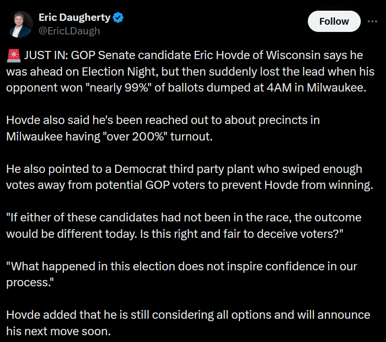 nearly 99% of Milwaukee votes dumped at 4 AM went to his Democrat opponent
