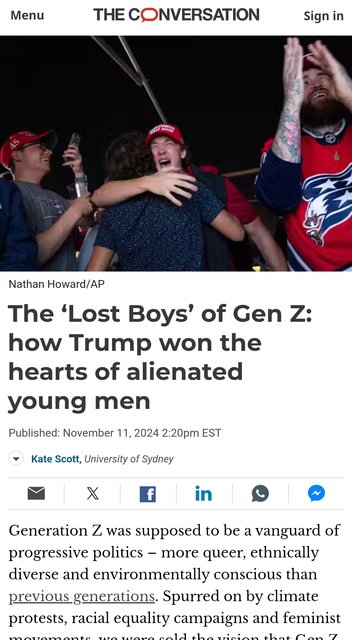 The reason Trump won Gen Z men is very simple. It's because they want to be what men have always been...MEN! They don't want to be this feminized group of pussies the left and media desperately wants them to be and tried to portray as the new image of "masculinity". As such, they rejected the party trying to make them be women...or at least bi-curious.