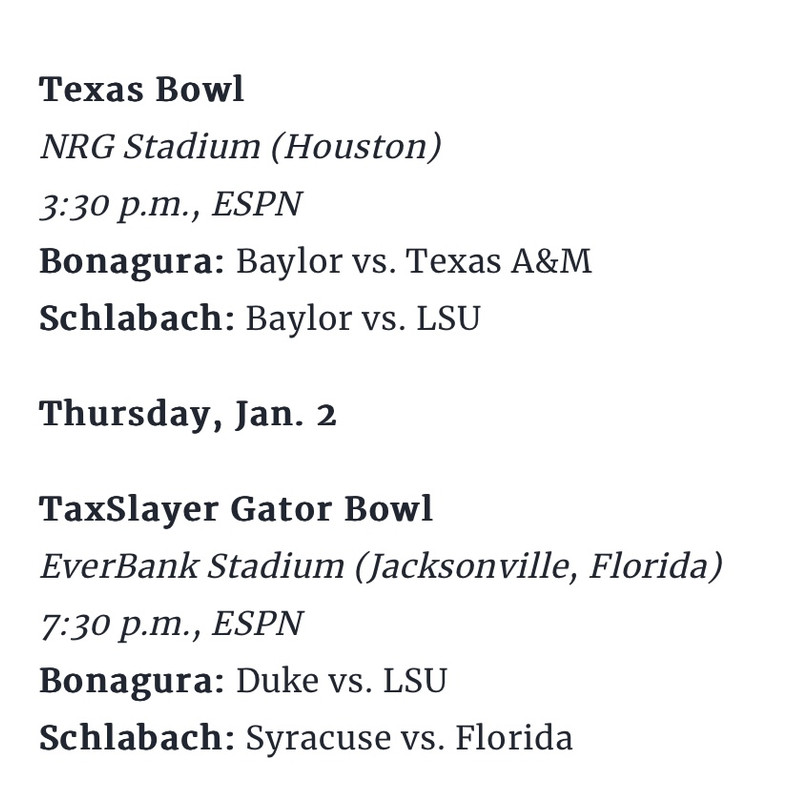 In ONE prediction I saw today, it would be Nebraska vs LSU in the Music City Bowl. I have always favored LSU matching UP in bowl games...meaning playing a team higher ranked so there is more to gain. Obviously, Nebraska wouldn't be it since they finished 6-6.