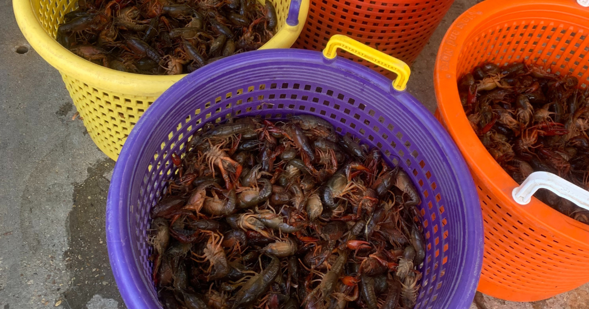 I have a large metal washtub that I can easily fit 40+ lbs. of crawfish in and will dump the sack in there, fill with cold water and give them a good mix to start getting the dirt off.