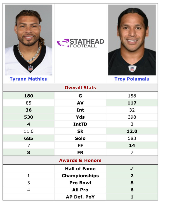 One big defensive stat left off of that graphic is tackles for loss. Polamalu had 56 while Mathieu only had 16.