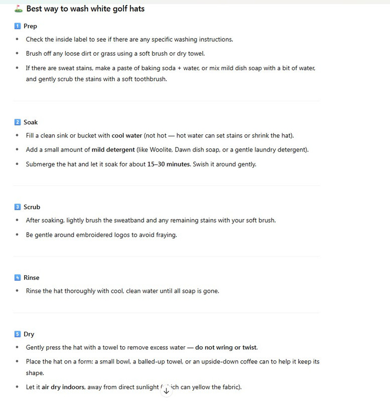 If I'm at home or in the hotel showering after a round, I'll take my hat or visor in there with me and use soap and a washcloth to wash the hat too. When finished, I leave it hanging in the shower to drip dry.