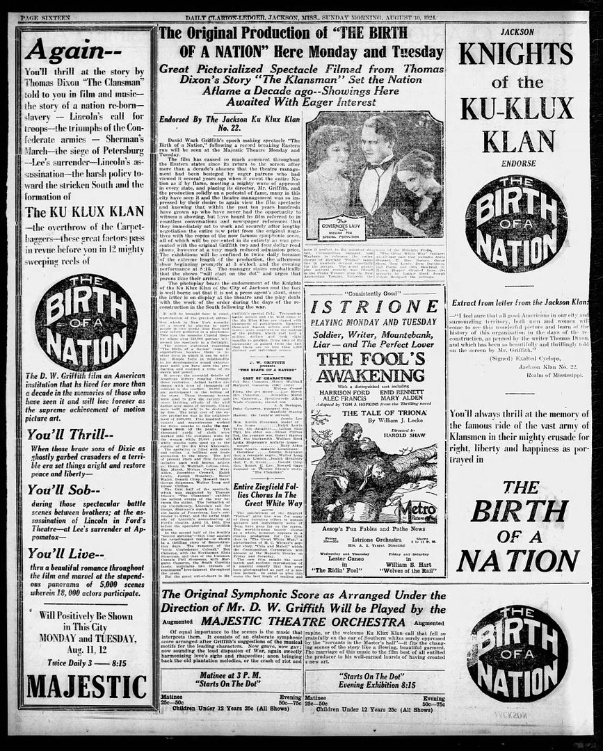This is an ad that ran in the Jackson newspaper over 100 years ago. Racist as hell. It's forerunner play, The Clansman, ran multiple times in Jackson as well.