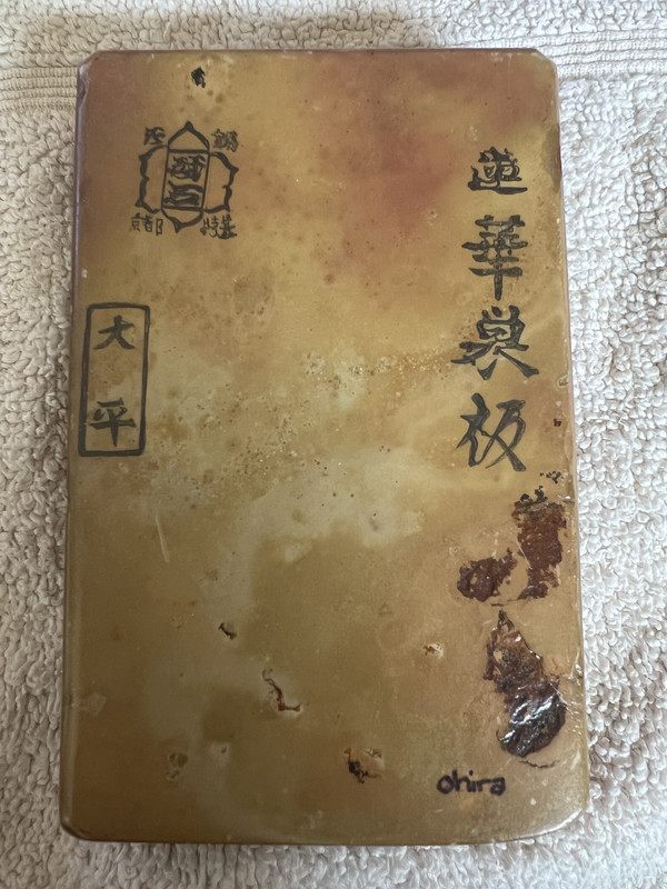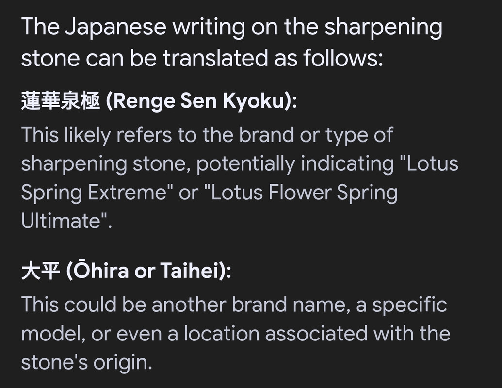 The object in the image is a natural Japanese whetstone, used for sharpening blades. The text written on it is in Japanese kanji, along with some English. Here’s a breakdown of what it says: • On the right-hand side (vertical text): “????” (Renge Sen Ita) – This refers to a specific type or grade of natural whetstone. • The boxed text on the left: “??” (Ohira / Taihei) – Likely indicating the quarry or brand name. “Ohira” is a famous mine in Kyoto known for producing very high-quality sharpening stones. • The bottom right in English: “ohira” – Reinforces that this stone comes from the Ohira mine. • The top crest-like mark is likely a mine or wholesaler’s seal, certifying authenticity. This appears to be a Japanese natural sharpening stone from the Ohira mine, which are highly prized by chefs, carpenters, and collectors for their polishing qualities.