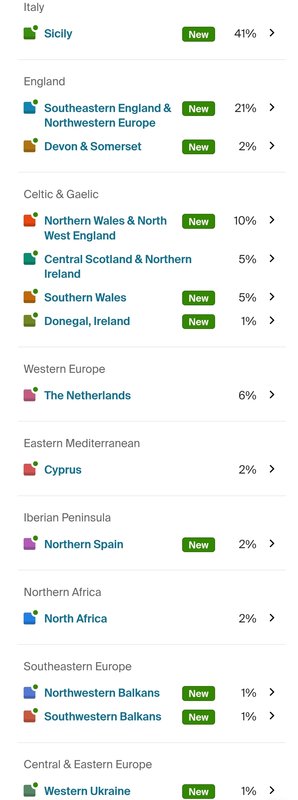 My previous was like 80% England/Europe but now is 50% Southeastern England and Northwestern Europe with 32% Central Scotland and Northern Ireland. As well as some Wales, Donegal, and Muenster, Ireland in smaller percentages.