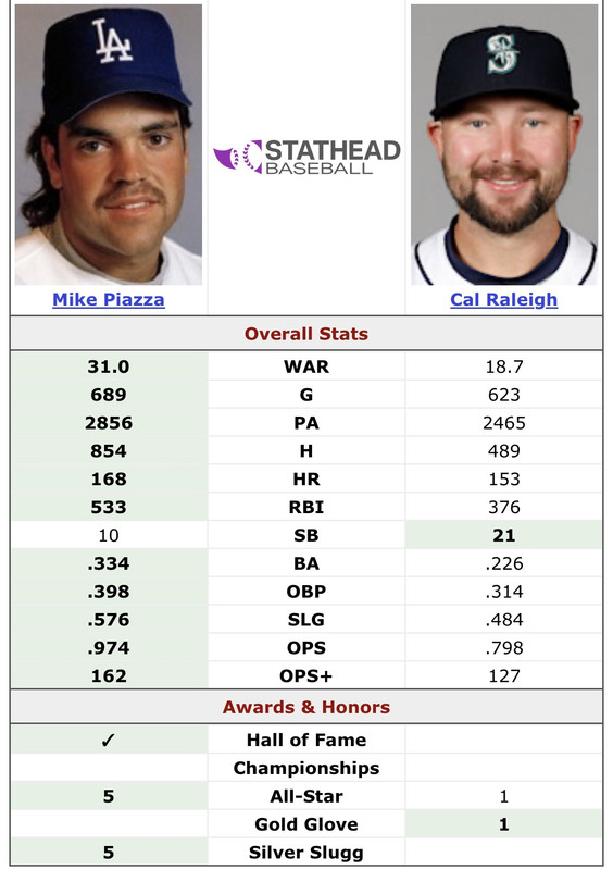 Raleigh is a better defensive catcher and has the one 60HR season but he has a long way to go to pass Piazza. If he surpasses Piazza career wise he will then be the greatest offensive catcher of all time