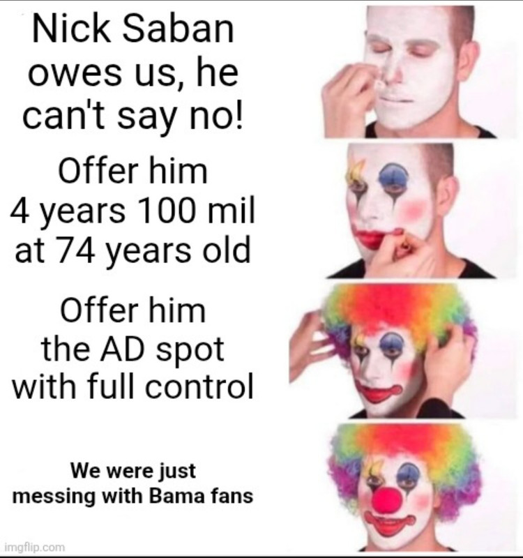 He’s still not your coach and that makes us happy. Your dynasty is over. DeBoer isn’t the answer and you won’t win another natty for about 20 years.