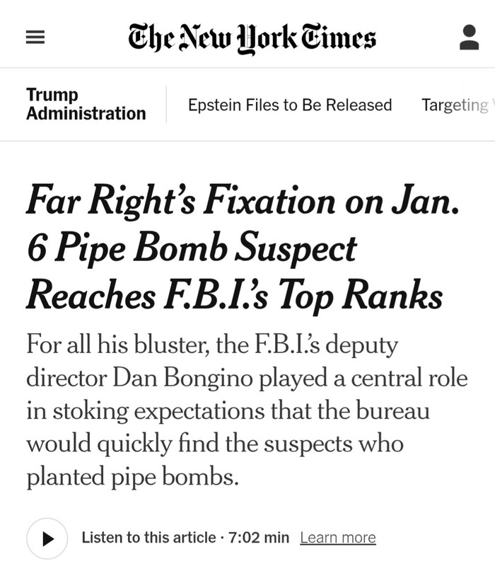 All narrative, all the time from NYT: "We don't know exactly WHO planted the pipe bombs, but like all the violence of that day, you can be sure it was a Trump-supporting insurrectionist. You hate Democracy and are a far right loon if you want the J6 pipe bomber arrested. People who plant pipe bombs never do it again, so why would you need to know who did it?"