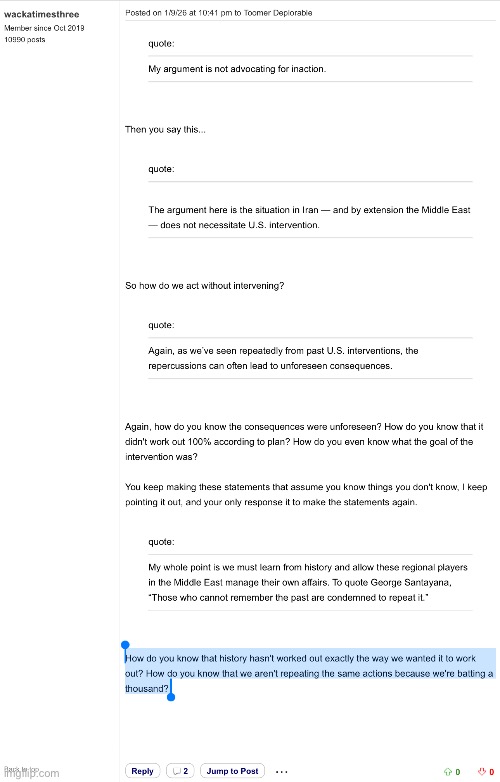 And wacka — a virulent #neverTrumper — will gladly serve as their Pied Piper. In another thread, wacka suggests that our nation’s past disastrous interventions in Afghanistan, Iraq, Syria, Libya, etc… weren’t mistakes or miscalculations, but instead were part of a larger, orchestrated strategy: