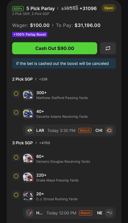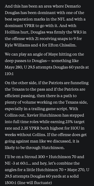 From Judah of PFF. Im going way more conservative than these numbers but putting some coin on Maye / Douglas and Maye / Diggs and Maye / Boutte. Also think Stroud could run some today and the prices are very lucrative if he does