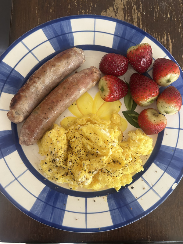 Eggs, sausage, strawberries