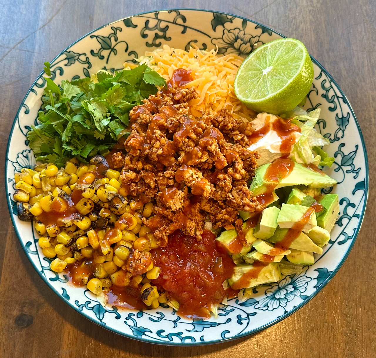 Taco salad. Crushed some nacho cheese Quest chips on top after this.