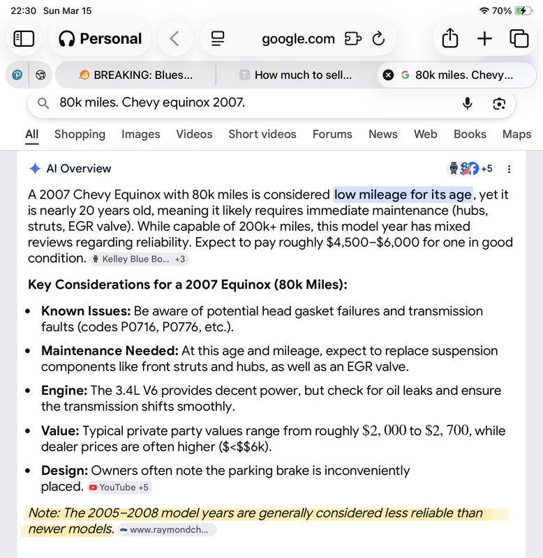 t has 80k miles. Chevy equinox 2007. Leather interiors. Needs a new battery which I will do before I sell. It has peeling paint on the rear quarter panels and needs the AC repaired.