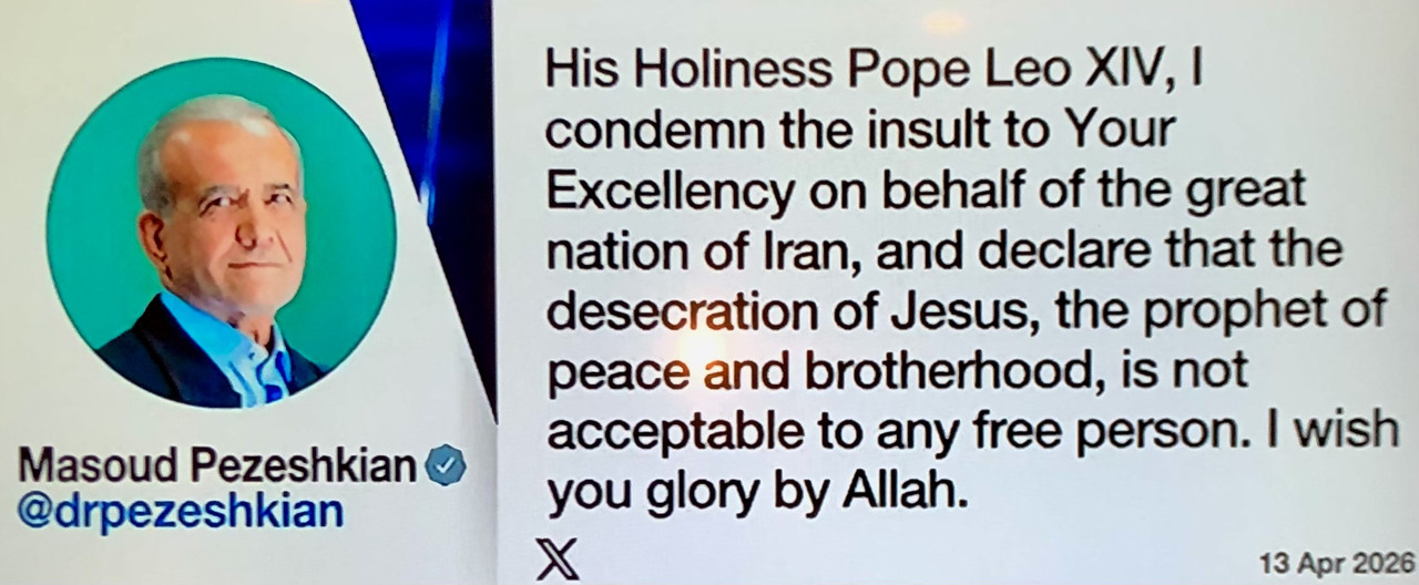 This image is a screenshot of a social media post on X, dated April 13, 2026, from the verified account of Masoud Pezeshkian (@drpezeshkian).