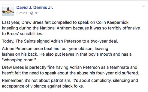 So let me get this straight? Drew Brees not objecting to his employer hiring an employee who beat his own kid somehow translates into Brees "accepting" violence against black folks which in this instance is violence committed by one black person (Peterson) against another presumably black person (Peterson's son)?