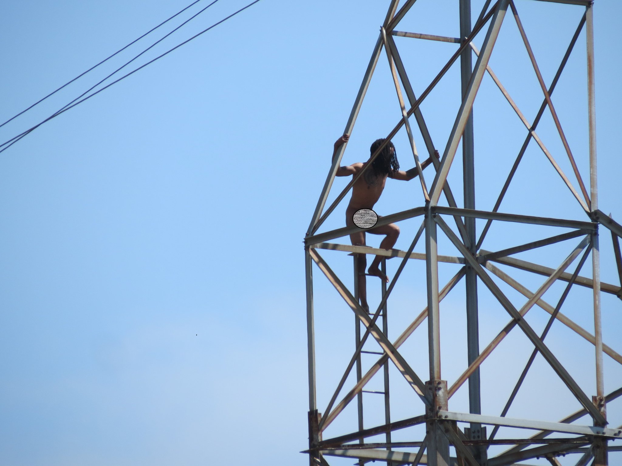 The dude is naked. Five stories up. On an electrical tower.