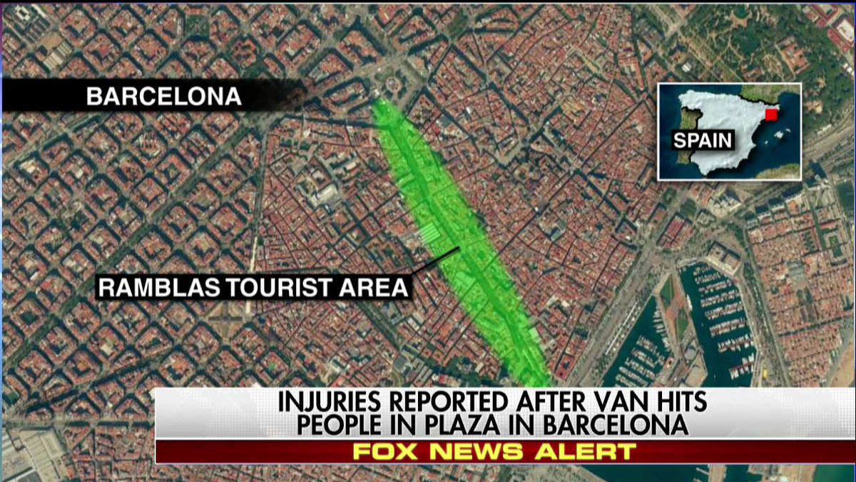 Plaza Catalunya - north side - entrance to Las Ramblas - literally the most obvious spot . Thousands of tourists there at any given moment . Security is VERY heavy at that choke point. Easy to run down an ally.