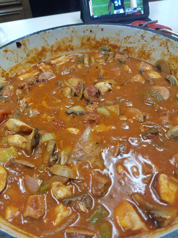 I made a gumbo at the Port Eads houseboat one cold January day that had chicken, duck, sausage, Redfish, shrimp, rabbit and yes a can of diced tomatoes. Duck, rabbit and Redfish caught and killed that day with the shrimp being bought off the boat at the fuel dock still dripping in seawater. It was a 5 gallon cast iron jambalaya pot full and a group of grown men demolished it.