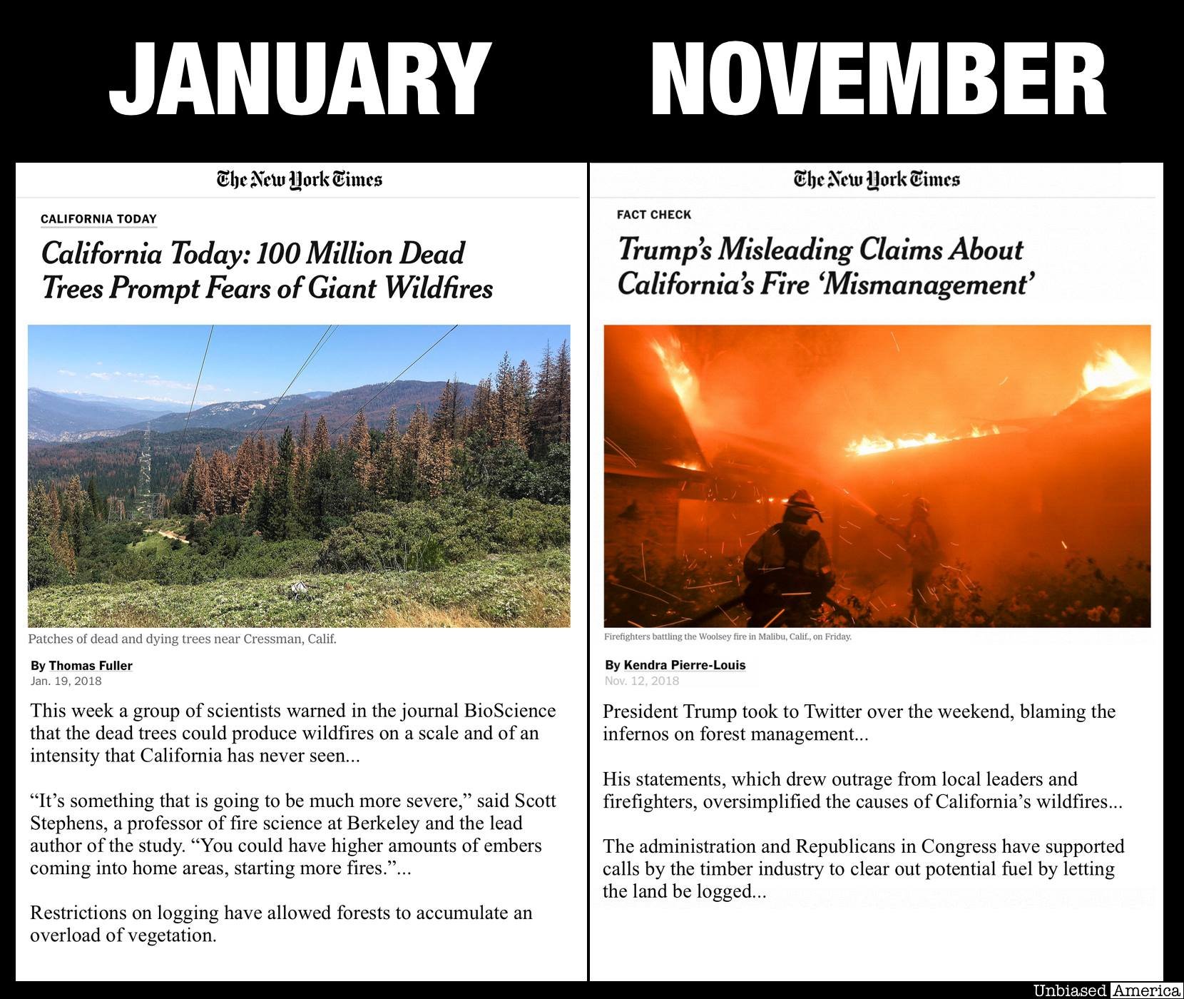 the NYT criticized trump for oversimplifying the causes of the fire, not for saying it was because of underbrush. it says so right in your picture.