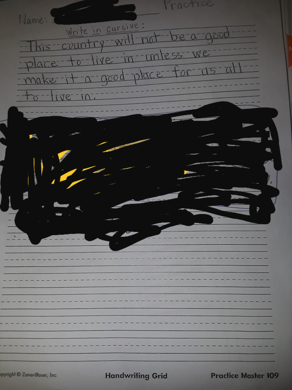 So the teacher is teaching cursive using a politically charged and grammatically incorrect statement?
