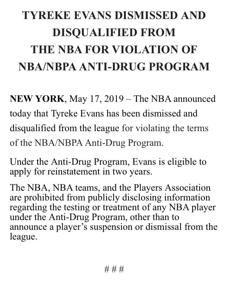 Pacers free agent Tyreke Evans has been dismissed and disqualified from the league for violating the terms of the NBA/NBPA Anti-Drug Program.