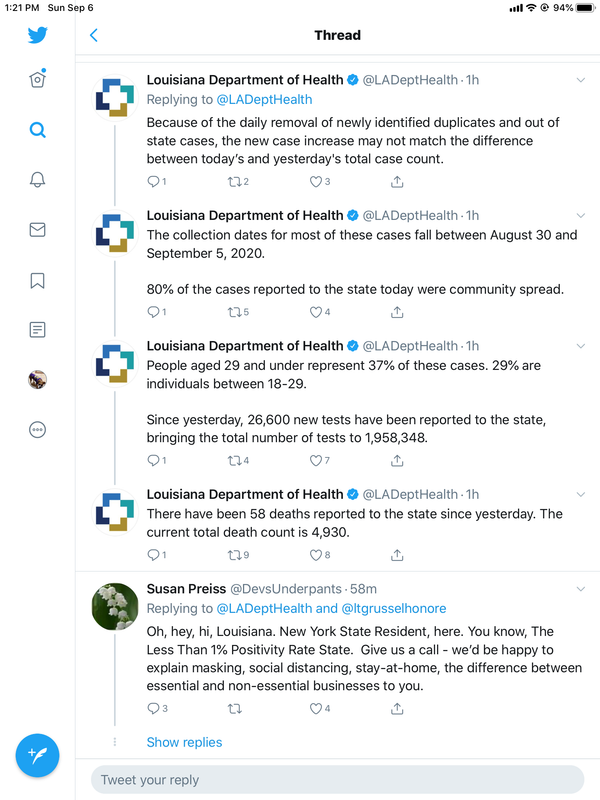Louisiana COVID-19 - September 6, 2020 Update: +1,387 cases; +58 deaths; -18 hospitalized