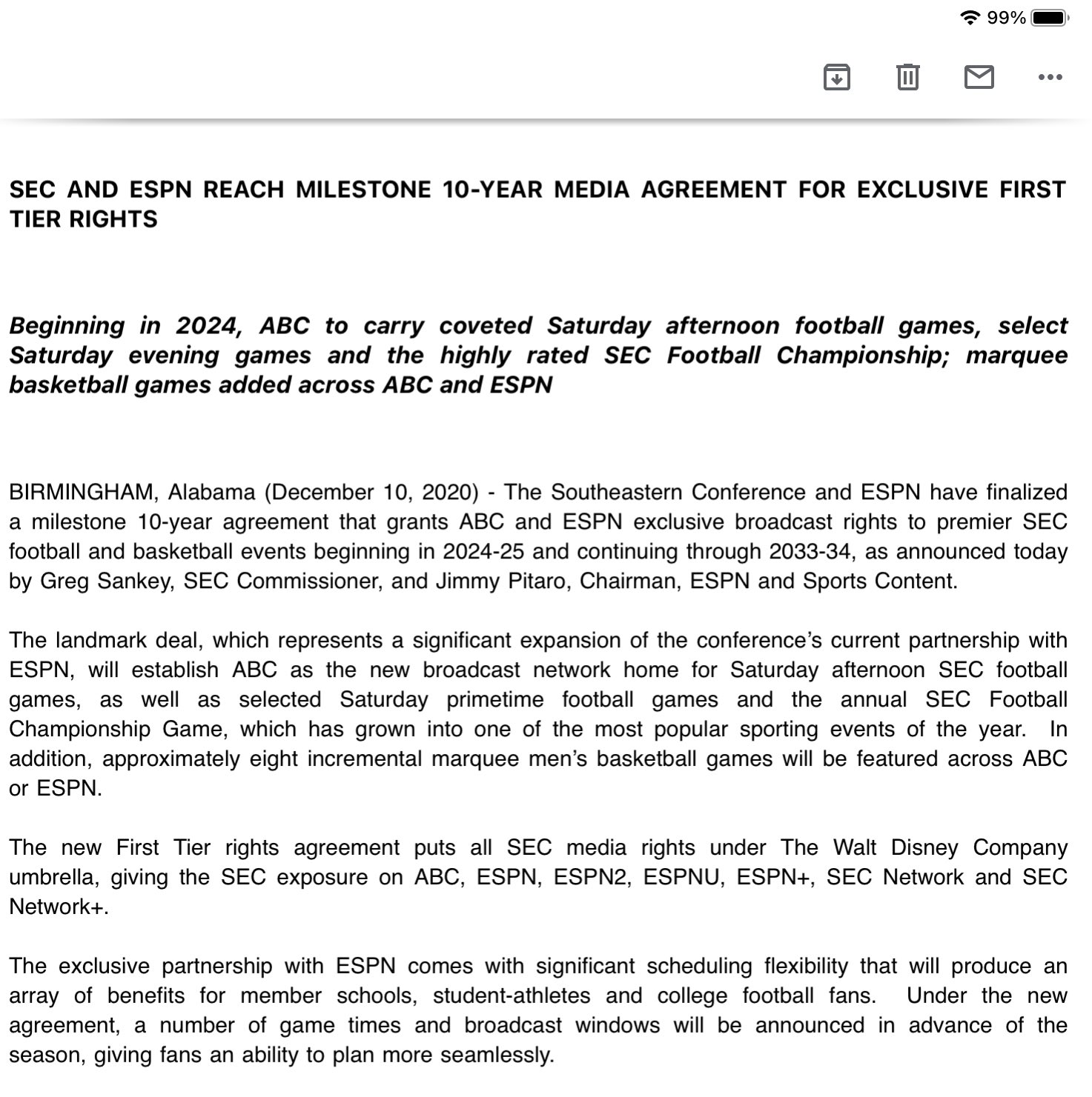 Disney announces its platforms will be the exclusive home of SEC sports. 10 yr deal w/SEC