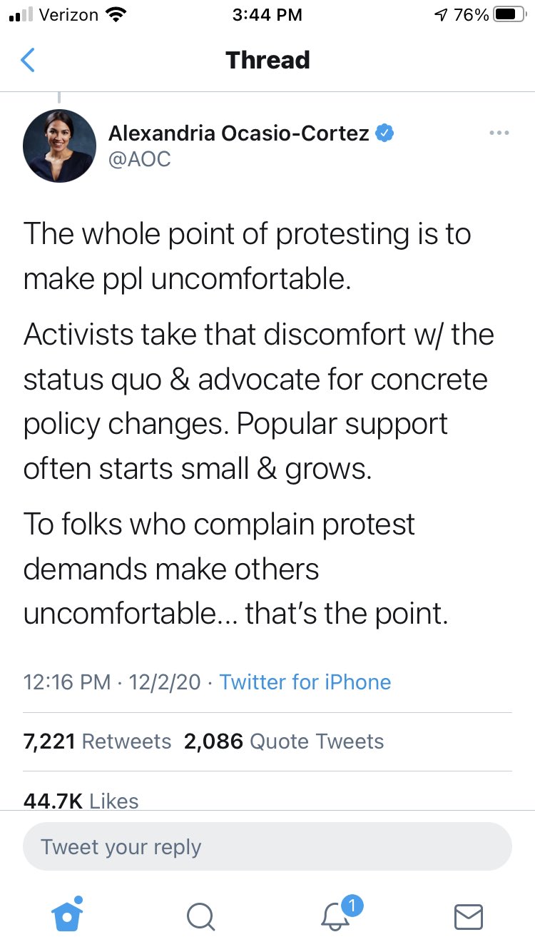 I’m not on Twitter, but can someone, for the love of GOD, screen shot her past tweets? Every one of them that were inciting more “protest/riots/resistance” from this summer, then Post them in the comments and remind her she has absolutely no moral high ground and she hasn’t taken this time for self reflection...and should resign!