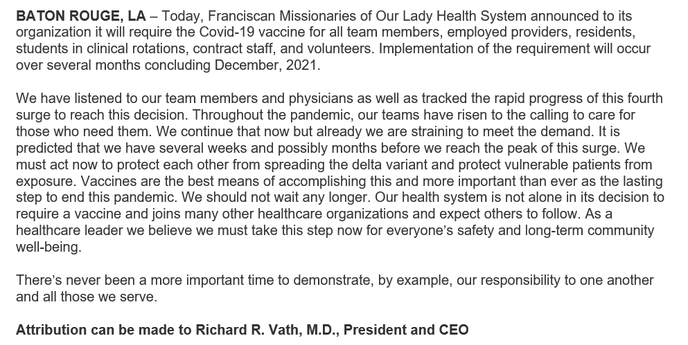 Today, Franciscan Missionaries of Our Lady Health System announced to its organization it will require the Covid-19 vaccine for all team members, employed providers, residents, students in clinical rotations, contract staff, and volunteers. Implementation of the requirement will occur over several months concluding December, 2021.We have listened to our team members and physicians as well as tracked the rapid progress of this fourth surge to reach this decision. Throughout the pandemic, our teams have risen to the calling to care for those who need them. We continue that now but already we are straining to meet the demand. It is predicted that we have several weeks and possibly months before we reach the peak of this surge. We must act now to protect each other from spreading the delta variant and protect vulnerable patients from exposure. Vaccines are the best means of accomplishing this and more important than ever as the lasting step to end this pandemic. We should not wait any longer. Our health system is not alone in its decision to require a vaccine and joins many other healthcare organizations and expect others to follow. As a healthcare leader we believe we must take this step now for everyone’s safety and long-term community well-being.