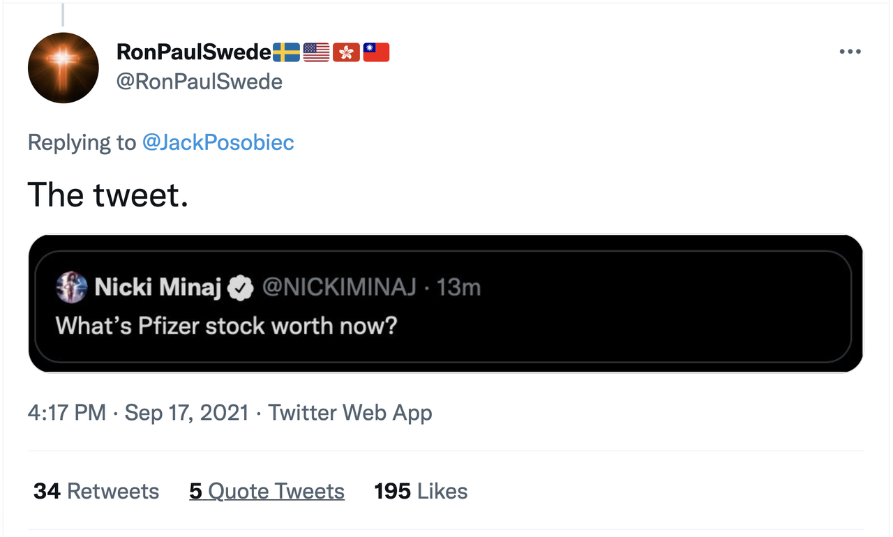 She should be inquiring about BioNTech at $360 a share versus Pfizer that's only moved like $7 a share since being approved in 2021. Pfe is and will always be a flat range stock with a decent dividend. Too many shares outstanding for growth.