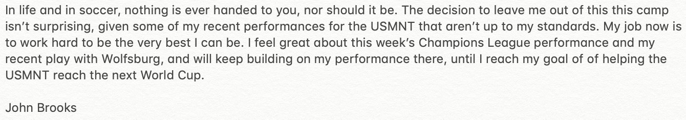 That’s a really classy statement by Brooks. And I think a dumb decision by Berhalter. Leaving Brooks off to take McKenzie/Richards. Neither of these guys are lighting it up either with their clubs and neither has shown they can touch the ceiling of play Brooks has in the past.
