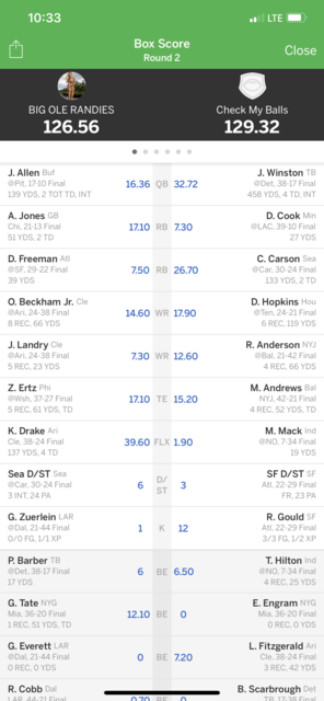 Hell yea! Congrats man. I don’t understand what’s up with the Thursday stat corrections? I lost out on several free agents I would’ve picked up this week, had I known I was still alive. Breshad Perriman, mainly.
