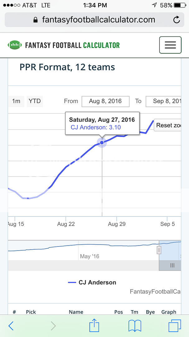 We drafted after the first preseason games, which was the earliest i've ever drafted, and didn't like it at all. CJ went in the 7th round in a 10 team ppr. He went first round the year before. that pissed a lot of people off, and as i said before, Hillman had better stats from last year and we had no indication at that time that he was going to get cut. hell they split carries in the first preseason game. WHy would anyone think that CJ would be a reliable RB1 after the first preseason game? You had very little to go on to think he'd be even a RB2.