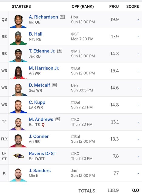 Unfortunately no, I'm going to have to blow my waiver budget on the first QB that gets injured. I feel good if Fields takes over for Wilson, but if Wilson is the QB for the whole season I may be screwed. I waited too long for my QB2, but the value never seemed to be there when it was my pick. I went into the draft thinking that I was going to go QB/QB picking 12th, and maybe I should've gone with Kyler over CeeDee, but the value seemed too good with landing CeeDee at pick 12. Chase went before Tyreek and CeeDee in my draft, if it fell differently and CeeDee and Tyreek were gone and my choice was Chase or Kyler, I would've gone with Kyler, but stacking Dak and CeeDee was too much potential to pass up.